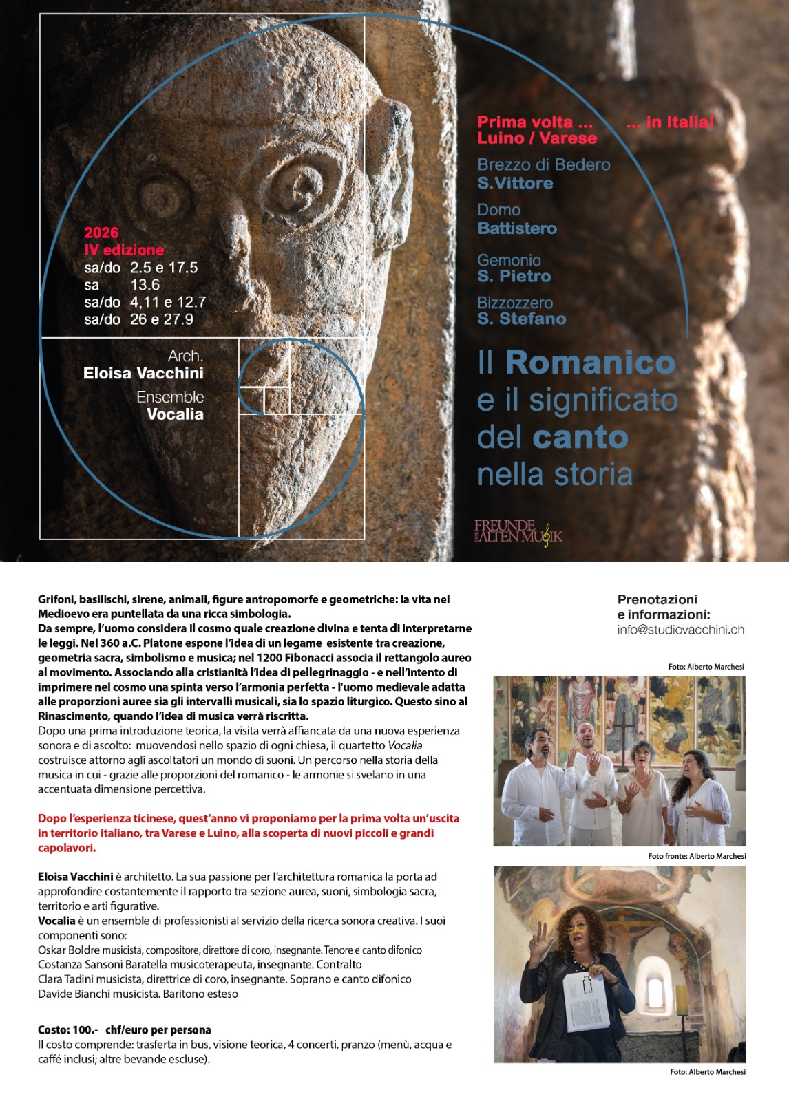 An immersive experience aimed at exploring the spectrum of the human voice in relation to acoustics, from Pythagorean intervals to diphonic singing. Sacred repertoire from the 4th century to contemporary, with improvisations and timbral-acoustic experiments. The quartet avails itself of the valuable collaboration of architect ELOISA VACCHINI, who proposes cultural journeys to discover Romanesque churches.